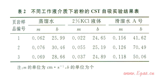 分別采用巖粉CST(毛細(xì)管吸入時(shí)間)法、巖心CST法、巖心層理面或人工縫的CST法來評(píng)價(jià)不同工作液介質(zhì)作用下頁巖的水化分散特征、吸收外來液體的特征以及不同裂縫特征下頁巖吸收外來液體的特征。