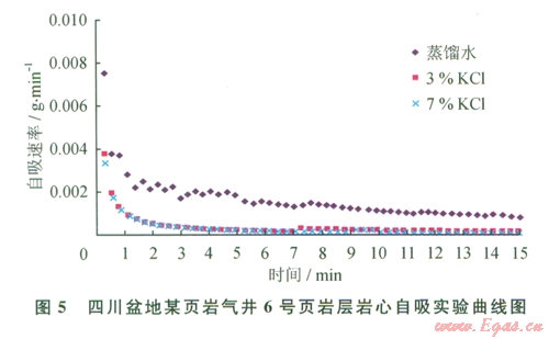 從圖4、5中可以看出:①總的吸液量極少,均表現(xiàn)為初期的吸液量最大,在前3 min吸液速率相對(duì)較大,而3 min后自吸曲線趨于平直,吸液量基本趨于零。②對(duì)于5號(hào)頁巖層,3%KCl的自吸量最大,7%KCl及未加任何添加劑的蒸餾水巖心自吸量最??;對(duì)于6號(hào)頁巖層,未加任何添加劑的蒸餾水自吸量最大,3%KCl和7%KCl的自吸量最小。③不同層段的頁巖吸液量具有明顯的差異,與黏土礦物含量相關(guān),黏土礦物含量較高的5號(hào)巖心吸液量高于含量較低的6號(hào)巖心。
