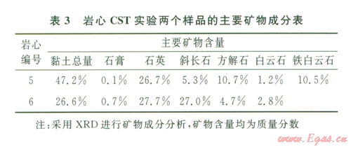 選取兩個(gè)不同層段的巖心進(jìn)行了CST實(shí)驗(yàn),兩個(gè)巖心的主要礦物成分見表3,圖4、5顯示了不同層段頁巖的巖心自吸實(shí)驗(yàn)結(jié)果。