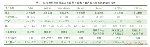 將研究區(qū)2套泥頁巖層與美國主要產(chǎn)氣頁巖層各項(xiàng)參數(shù)對比,結(jié)果發(fā)現(xiàn):遼河坳陷東部凸起上古生界泥頁巖地化參數(shù)較好(表2),進(jìn)一步表明該區(qū)上古生界泥頁巖具備頁巖氣存在的條件,具有很好的開發(fā)潛力,可作為頁巖氣下一步要尋找的目標(biāo)。