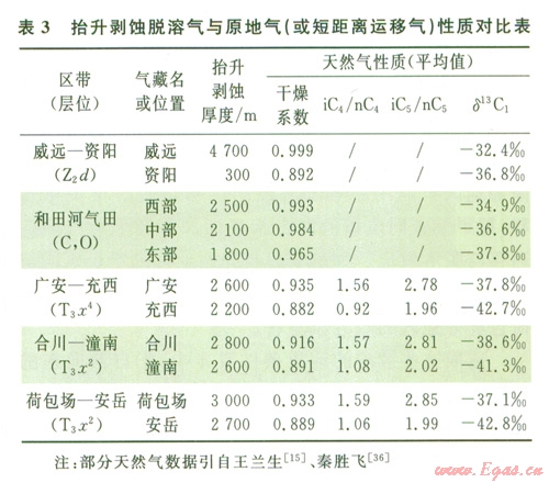 喜山期地層強烈抬升與剝蝕并產(chǎn)生水溶氣的脫溶作用進而形成大氣田的實例,在國內外都有發(fā)現(xiàn)。如西西伯利亞盆地上白堊統(tǒng)烏連戈伊氣田[31-32]、四川盆地威遠震旦系氣田[14-15]、四川盆地中部須家河組氣田[33-34]、塔里木盆地和田河氣田[10,35-36]等。這種水溶氣脫溶作用形成的天然氣田,其地質效應主要表現(xiàn)在天然氣組分變化與碳同位素值的變化上。具體而言,其主要地質現(xiàn)象是氣藏底部或側翼水體巨大(或圈閉大而充滿度低),產(chǎn)生的地質效應是甲烷含量高(或干燥系數(shù)大)、異構烷烴增加、富集重碳同位素、存在側向運移效應等。