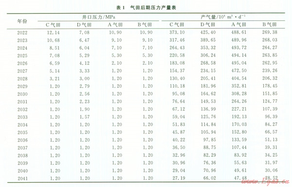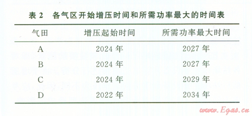 各氣區(qū)后期壓力產(chǎn)量見表1,增壓時(shí)間和所需功率最大時(shí)間見表2。根據(jù)表l、2對兩個(gè)增壓方案進(jìn)行詳細(xì)論證比選。