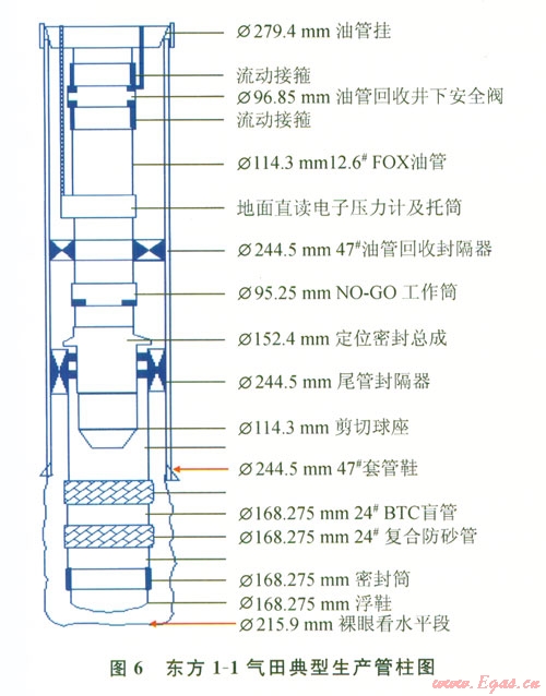 東方l-1氣田具有高產(chǎn)、C02含量較高的特點(diǎn)。作為中海油自營開發(fā)的首個(gè)氣田在開發(fā)所面臨的最大問題就是安全開發(fā)問題。作為安全生產(chǎn)的第一屏障生產(chǎn)管柱結(jié)構(gòu)的設(shè)計(jì)選擇尤其重要。生產(chǎn)管柱的設(shè)計(jì)和下人須滿足低壓力損耗,使用壽命長,滿足氣藏動態(tài)監(jiān)測的要求[2]。油管選用強(qiáng)度高、密封性好、內(nèi)孔平滑和可多次重復(fù)上扣l3Cr FOX油管。上部設(shè)計(jì)井下安全閥,保證氣井在緊急狀況下安全可靠關(guān)閉,及時(shí)切斷氣源。安全閥為全金屬密封(氣密封)。采用雙封隔器結(jié)構(gòu)保證安全生產(chǎn)的需要,增加封隔油套管環(huán)空的可靠性,降低完井作業(yè)返工率:第一密封由插人密封總成與防砂尾管懸掛封隔器組成,第二密封為油管回收封隔器。管柱底部用液壓剪切坐封球座,避免在大斜度井鋼絲作業(yè)坐封封隔器(圖6)。