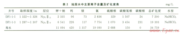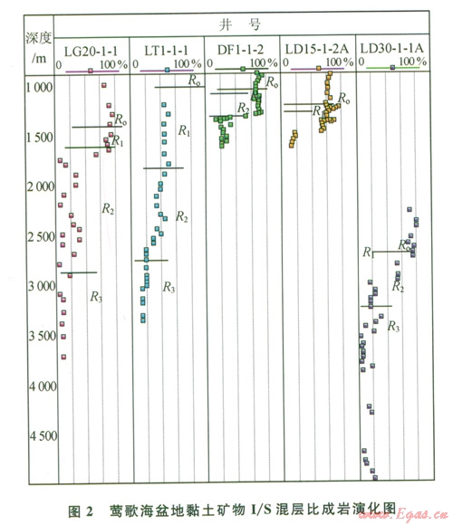 超高溫中央底辟帶的東南區(qū)黏土礦物以綠泥石、伊利石為主;東方區(qū)、樂東區(qū)雖然以伊/蒙混層、伊利石為主,但在熱流體活躍層段出現(xiàn)高嶺石、綠泥石含量異常,如東方區(qū)和樂東區(qū)l 500 m上下出現(xiàn)高嶺石含量增高、綠泥石含量降低異常層段,這是由于大量的C02隨著熱流體從深部向上運移,在中淺層聚集,并溶于水中,碳酸根含量增加,隨后碳酸釋放出H十,使地層水呈酸性,促使綠泥石向高嶺石轉(zhuǎn)化的結(jié)果。另外在熱流體作用下,出現(xiàn)蒙脫石向伊利石轉(zhuǎn)化突變異常現(xiàn)象,如靠近斷裂的DFl-1-2井(圖3)在1 200~1