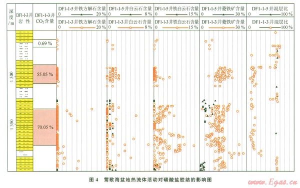 鶯歌海盆地淺高溫碳酸鹽膠結(jié)物與熱流體活動有關,東方1-1,樂東15-1淺中層膠結(jié)物示,含鐵白云石和含鐵方解石的形成溫度間,這些高溫礦物可產(chǎn)出在1