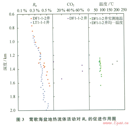 強烈的熱流體活動是鶯歌海盆地的重要地質(zhì)特征之一,底辟活動致深部熱液的該盆地年輕的海相烴源巖受熱歷史較短,由此引起局部地溫場的疊加,從而促進有機質(zhì)熱演化和生烴作用[6]。