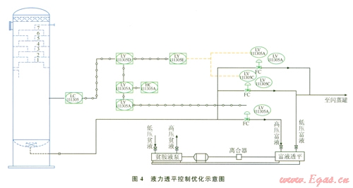 針對(duì)上述問題,普光天然氣凈化廠從儀表控制角度對(duì)液力透平進(jìn)行了優(yōu)化,增設(shè)了2條不同尺寸的透平跨線和配套的復(fù)雜控制回路(圖4),實(shí)現(xiàn)在保證裝置生產(chǎn)穩(wěn)定的基礎(chǔ)上,液力透平能穩(wěn)定、有效地回收利用富胺液的靜壓能。