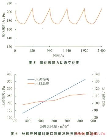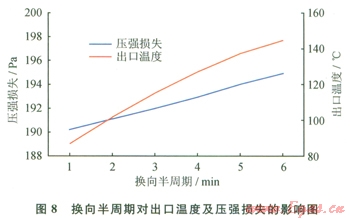 圖8描述的是換向半周期與氧化床壓強損失及出口溫度之間的關系(乏風量為