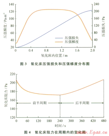 2)在任意周期內,氧化床阻力在前半周期內隨時間增加而不斷降低,進入后半周期后,氧化床阻力開始回升,到后半周期結束時恢復到該周期開始時的阻力值;氧化床阻力隨著氣流方向的周期改變以v型波的形式呈現(xiàn)周期性變化。
