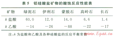 有學(xué)者研究了鹽酸與各種鋁硅酸鹽礦物的反應(yīng)動(dòng)力學(xué),并將反應(yīng)速度常數(shù)的對數(shù)值為50時(shí)對應(yīng)的溫度(T50)作為各種鋁硅酸鹽在鹽酸中保持穩(wěn)定的溫度上限,各種鋁硅酸鹽的T50值如表5所示。表5同時(shí)也給出了根據(jù)熱力學(xué)數(shù)據(jù)計(jì)算出來的鹽酸與醋酸與各種鋁硅酸鹽礦物反應(yīng)的平衡常數(shù)。可以看出,在熱力學(xué)上,這些鋁硅酸鹽均可以溶于鹽酸,但幾乎完全不溶于醋酸;而在動(dòng)力學(xué)上,沸石在鹽酸中最不穩(wěn)定,綠泥石次之,長石最穩(wěn)定。在儲層中占優(yōu)勢的鋁硅酸鹽礦物的T50低于儲層溫度時(shí),應(yīng)該考慮在酸化液中用乙酸代替鹽酸[6-8]。