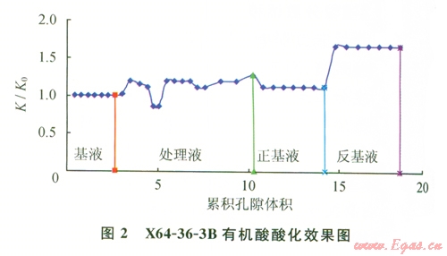 可考慮采用乙酸并適當(dāng)加大注酸量。乙酸為弱酸,既可均勻溶蝕礦物表面、擴(kuò)大疏通孔喉,又可避免黏土殘片脫落造成微粒堵塞喉道。