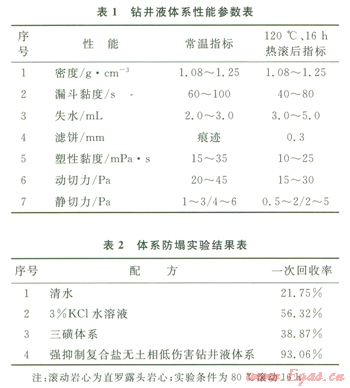 考慮體系總固相含量控制的要求和強(qiáng)抑制性的需要,重點(diǎn)研究了可溶性有機(jī)鹽、無機(jī)鹽在提高液相密度和鉆井液抑制性的作用,體系防塌實(shí)驗(yàn)結(jié)果見表2。有機(jī)鹽溶液自身具有較高的密度,僅其水溶液密度就可超過1.25 9/cm3,復(fù)配使用無機(jī)鹽就可以提高體系的抑制性,以滿足防塌的要求。另外輔以G302-SZD等即可形成具有較好封堵作用的濾餅,進(jìn)一步提高體系的防塌效果。
