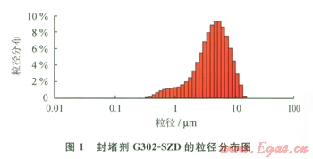 由圖l可以看出,封堵劑G302-SZD的最大粒徑在13μm,主要粒徑分布在2~5μm,根據(jù)“?~2/