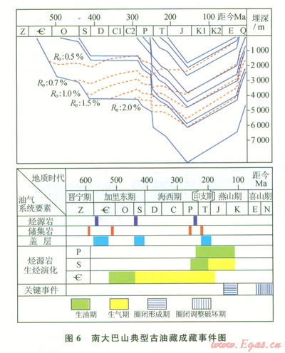 結(jié)合南大巴山的構(gòu)造發(fā)育史,該區(qū)油氣藏成藏過(guò)程可以分為3個(gè)階段:晚三疊世—早侏羅世開(kāi)始變形,形成寬緩背斜,形成古油藏;中侏羅世—早白堊世進(jìn)一步變形,圈閉構(gòu)造定型,部分古油藏裂解,形成油氣藏;古近紀(jì)喜山運(yùn)動(dòng)對(duì)先期構(gòu)造進(jìn)行了強(qiáng)烈的改造,造成古油氣藏的調(diào)整與破壞。