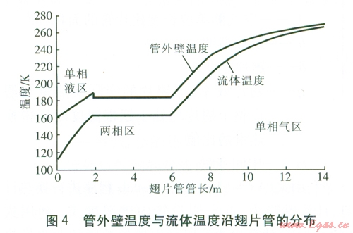 管外壁溫度在單相液區(qū)急劇升高,到達(dá)兩相區(qū)后有一個(gè)突降,而后保持不變,到達(dá)缺液區(qū)后逐漸升高,在單相氣區(qū)也是緩慢升高。由管外壁溫度沿翅片管的分布可以看出,在單相液區(qū)和兩相區(qū)的核態(tài)沸騰區(qū),即從人口至管長(zhǎng)大約6m處,管外壁溫度較低,容易發(fā)生結(jié)露或結(jié)霜現(xiàn)象。