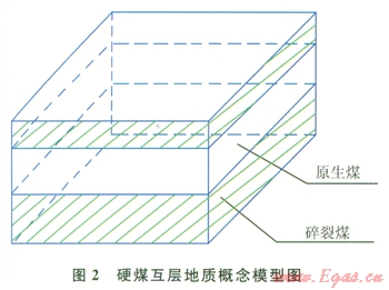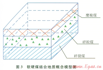 當煤層段形成過程、形成后遭受的構造運動強烈程度不同時,導致煤層段巖石力學性質差異性較大時,即軟煤(碎粒煤和糜棱煤)和硬煤共存,第一次壓裂時,大部分壓裂液進入軟煤,壓裂效果不甚理想,為了在硬煤中進行壓裂,則需要使用投球技術,此類情況的地質概念模型如圖3所示。