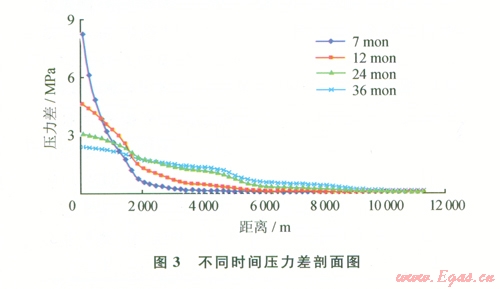 根據(jù)數(shù)值模擬軟件運算結(jié)果,繪制典型剖面壓力分布圖,當(dāng)注入7個月后井底壓力達(dá)到28 MPa,壓力逐漸向外為擴散,若假設(shè)不注條件下,由于南區(qū)和長北合作區(qū)壓力差的存在,壓力波也會隨時間的延長向外擴散。用以上兩個壓力剖面相減,即可得到壓力剖面上注采過程中不同距離與壓力差之間的關(guān)系(圖3)。設(shè)置可以觀察的基準(zhǔn)壓力值,即可得到不同注采周期下,壓力波的傳播距離在1、2、3年的注氣周期下壓力波傳播距離分別為4. km、6.1 km和7.6 km。