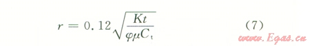 對于低滲透氣藏,當(dāng)氣井生產(chǎn)達(dá)到一定階段后,利用產(chǎn)量不穩(wěn)定分析法計算的結(jié)果是可靠的,即該時刻氣井進(jìn)入了擬穩(wěn)定狀態(tài),壓力波及了氣井所能控制的全部范圍。該方法對氣井生產(chǎn)動態(tài)數(shù)據(jù)要求不高,適合于工作制度不穩(wěn)定的氣井,具備廣泛使用的條件,但該方法實質(zhì)是通過分析確定氣井控制半徑,利用容積法計算氣藏儲量,對非均質(zhì)氣藏存在一定的誤差。