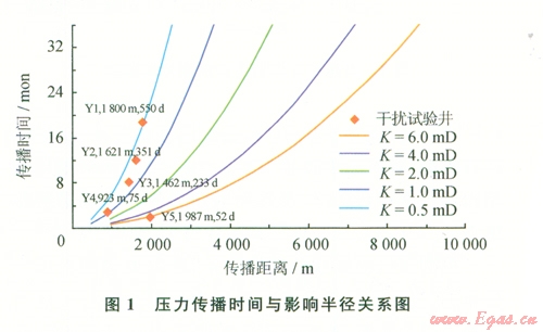 根據(jù)影響半徑計算公式,取榆林南儲氣庫建設(shè)區(qū)儲層孔隙度為0.06,天然氣黏度為0.02 mPa·s,綜合壓縮系數(shù)為0.02 MPa-1,分別對滲透率為0.5~6.0mD等不同條件下傳播時問與壓力影響半徑進(jìn)行計算,繪制壓力傳播時間與距離關(guān)系圖版(圖1)。