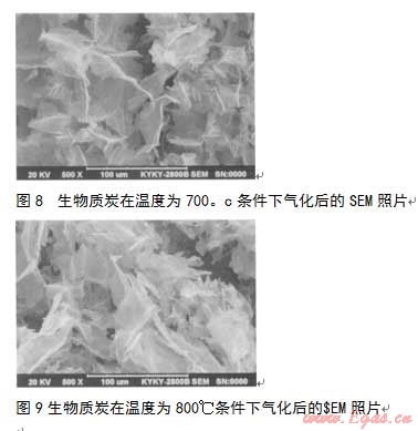 生物質(zhì)炭在蒸汽作用下發(fā)生氣化,其微觀結(jié)構(gòu)也會發(fā)生變化。使用掃描電子顯微鏡(SEM)對不同溫度下,生物質(zhì)炭經(jīng)過蒸汽氣化后的微觀結(jié)構(gòu)進行研究。生物質(zhì)炭在溫度分別為500、600、700和800℃條件下氣化后的SEM照片分別見圖6~9。