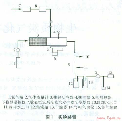 實驗裝置見圖l,該系統(tǒng)包括熱解反應器、蒸汽發(fā)生器、熱解氣冷卻裝置、檢測系統(tǒng)等。熱解反應器為長450 mm、內(nèi)直徑為70 mm的不銹鋼圓柱體。熱解反應器左端長200 mm的區(qū)域為材料存放區(qū),右端長200 mm的區(qū)域為生物質(zhì)熱解區(qū),50 mm長的中間問隔是為了減輕材料的預熱解。生物質(zhì)熱解區(qū)由獨立的電加熱器加熱,加熱功率為1.5 kW,溫度由K型熱電偶測量,并由數(shù)顯溫控儀進行控制。熱解反應器后接1個長度為300 mm的冷凝器,用以分離可凝結(jié)相和氣體。實驗裝置設(shè)置保溫層,氣體管道采用電加熱的方式保溫,溫度設(shè)定為300℃,主要是為了防止可凝結(jié)相凝結(jié)。水由數(shù)顯恒流泵送入蒸汽發(fā)生器,蒸汽由生物質(zhì)熱解區(qū)最左端加入,其溫度由一個E型熱電偶測量,并由溫控器控制。