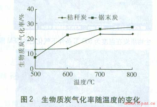 對兩種生物質(zhì)炭在不同溫度(分別為500、600、700、800℃)下的氣化特性進行研究。生物質(zhì)炭氣化率隨溫度的變化見圖2。