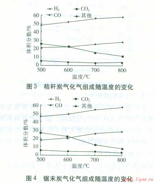 ①氣化溫度對炭氣化率具有重要影響。隨著氣化溫度的升高,炭氣化率增大。在實驗溫度和時問條件下,炭的氣化率最高不超過30%。鋸末炭的氣化活性比秸稈炭好。氣化溫度對氣化氣的組成影響較大。隨著氣化溫度的上升,H2體積分數(shù)顯著增大,C02體積分數(shù)顯著減小,C0體積分數(shù)較快增大。反應時間對炭的氣化率也有影響。隨著反應時問的增加,炭的氣化率上升,但是上升趨勢變緩。