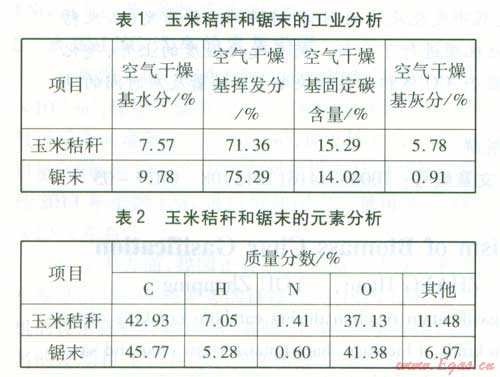 實驗所選材料分別為玉米秸稈和鋸末。玉米秸稈和鋸末均為常見的生物質(zhì)原料,其低熱值分別為15.84、20.10 MJ/kgl 71,工業(yè)分析和元素分析分別見表1、2。