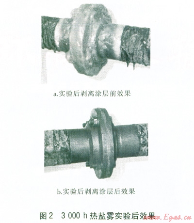 Enviropeel系統(tǒng)符合美國(guó)標(biāo)準(zhǔn)ASTMBll7《熱鹽霧實(shí)驗(yàn)》。圖2為在該標(biāo)準(zhǔn)下測(cè)試3 000 h之后的法蘭表面效果。實(shí)驗(yàn)表明,Enviropeel系統(tǒng)對(duì)其覆蓋范圍內(nèi)的金屬具有良好的防腐效果,而在沒(méi)有Enviropeel涂層保護(hù)的地方,如法蘭兩側(cè)連接處,則腐蝕非常嚴(yán)鶯。
