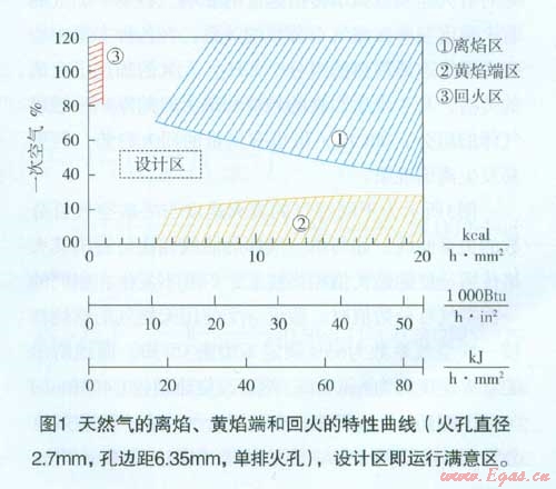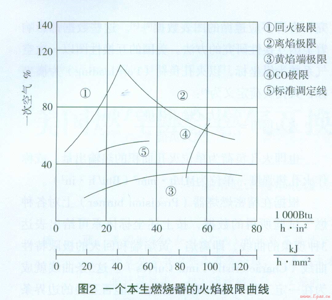 圖1中的中間范圍即燃具的設計范圍(DesighArea),也即滿意的運行范圍(SatisfactoryoperatingArea)。圖2中的⑤表示標準調(diào)定線。極限值相當于金屬材料試驗中的屈服極限,滿意的運行范圍或標準