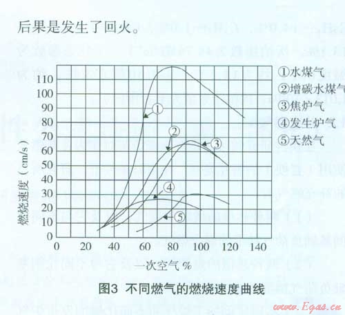 圖3所示為不同燃氣的著火速度與一次空氣百分數(shù)的關系曲線,如與單一氣體的曲線相比可看出其火焰?zhèn)鞑ニ俣鹊淖畲笾迪喈斀咏?,但并不發(fā)生在相同的一次空氣百分數(shù)值時。假設一個使用天然氣的燃燒器按一次空氣系數(shù)為65%調(diào)定(由圖3可知,曲線所示的著火速度約為9cm/s),然后改燒熱值為l400Btu/cf(52.16MJ/m3)的丁烷一空氣混合氣,則一次空氣百分數(shù)很快上升到80%,火焰?zhèn)鞑ニ俣冗_到29cm/s[5],后果是發(fā)生了回火。