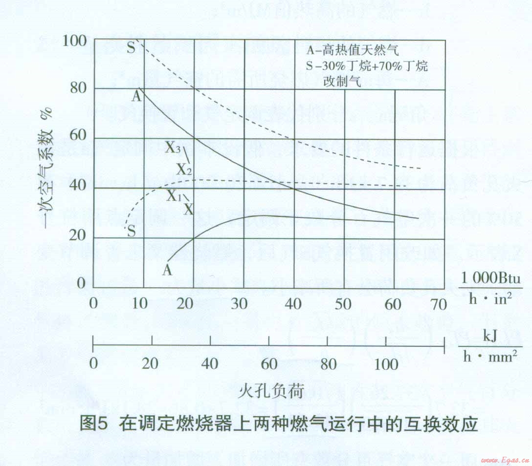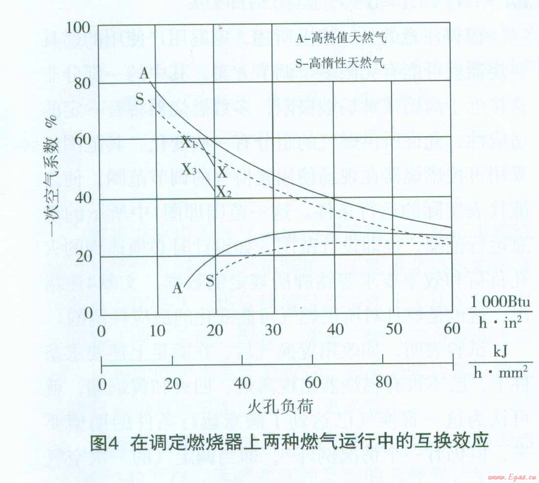 這說明用高熱值天然氣調(diào)定后的燃燒器在改用高惰性天然氣置換后,其運行工作點x。已高于高惰性天然氣的離焰極限曲線值(見圖4中X1的位置),會發(fā)生離焰。顯然,如調(diào)定點x置于調(diào)定氣的極限曲線上(一次空氣系數(shù)接近60%一見圖4),則置換后的工作點X1將遠高于置換氣的離焰曲線(圖上未表示),這一運行工況是完全不能接受的。在這一特殊的假設條件下,如燃燒器的調(diào)定是在同樣的火孔負荷下,但一次空氣系數(shù)略低于50%(約為42%,其工作點在圖4上用X1表示,則在用高惰性天然氣置換后,一次空氣百分數(shù)增加到PAx3=PAX2×1.1744=0.42×1.1744=0.4932即49.30%