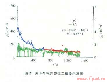 針對(duì)致密低滲儲(chǔ)層的滲流特征,假定儲(chǔ)層遠(yuǎn)端存在著一個(gè)移動(dòng)的、基本不滲透的(實(shí)際上是低滲)模糊邊界,當(dāng)氣井穩(wěn)定生產(chǎn)一段時(shí)間后,壓力波及會(huì)觸及到此邊界,此時(shí)產(chǎn)量、壓力會(huì)出現(xiàn)“擬穩(wěn)態(tài)”(圖2),在求取Pwf2-t關(guān)系曲線(近似直線)斜率后,可利用彈性二相法估算壓力波及范圍內(nèi)的可動(dòng)儲(chǔ)量。該儲(chǔ)量僅能代表壓力波及范圍內(nèi)的可動(dòng)儲(chǔ)量,隨著日后生產(chǎn)繼續(xù),累積產(chǎn)氣量增加,需要重復(fù)計(jì)算予以進(jìn)一步核實(shí)和校正。實(shí)踐證明,在不關(guān)井情況下,彈性二相法儲(chǔ)量具有重要的參考價(jià)值。蘇5區(qū)塊達(dá)到計(jì)算條件的氣井有41口,