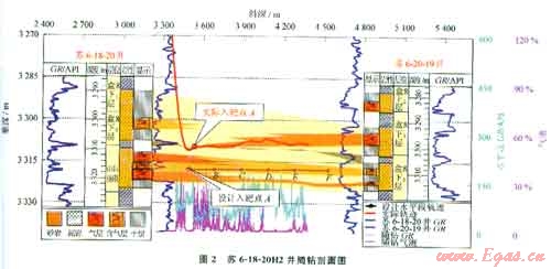 在鉆遇上部砂體頂部時井斜一般在80°左右,需要穩(wěn)斜基本查明上部氣層情況,如果上部砂層與參照井一致,可繼續(xù)快速下探按原設(shè)計入靶,而不至于造成過長的無效靶前距。典型井如蘇6-18-20H2井,在鉆遇目標砂層組上部單砂體時,砂體厚度變厚,由干層變?yōu)?/span>氣層,后調(diào)整入靶位置在上部單砂體入靶(圖2)。