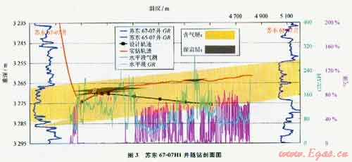 由于蘇里格氣田復雜的砂體疊置關(guān)系,常見以交錯單砂體所引起的“假構(gòu)造”,因此,水平段地質(zhì)導向關(guān)鍵是對水平井部署區(qū)域目標層“真假構(gòu)造”的識別。但無論是同一砂體真構(gòu)造,還是由不同砂體形成的假構(gòu)造,水平段施工都不應過分注重設(shè)計構(gòu)造趨勢而忽視巖性變化,應以“先追蹤砂體、后參考構(gòu)造”的原則靈活調(diào)整導向。以蘇里格氣田中區(qū)水平井施工為例,采取該導向方法取得了顯著效果,全年有5口井采取追蹤砂體導向而偏離設(shè)計井眼軌跡獲得成功,砂層鉆遇率明顯提高。典型井如蘇東67-07H1井,水平段末端與設(shè)計井眼軌跡偏差達11m,而砂層鉆遇率達到84.4%(圖3)。