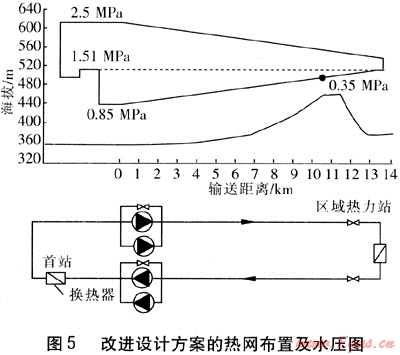 按靜態(tài)水力分析,初步設(shè)計方案是合理的,最大壓力在首站處(壓力為1.66MPa),外部管網(wǎng)靜態(tài)運(yùn)行壓力小于1.6MPa。動態(tài)水力分析顯示,初步設(shè)計方案的設(shè)計、運(yùn)行易由于壓力的大幅度波動產(chǎn)生超壓或汽化,導(dǎo)致嚴(yán)重的安全問題。為提高輸送干線的安全性,需對初步設(shè)計方案進(jìn)行改進(jìn):提高設(shè)計壓力,取消中繼泵站,系統(tǒng)最大壓力為2.5MPa;在首站處供水溫度提高為135℃,回水溫度不變,供回水溫差加大5℃,流量減小8%;首站循環(huán)泵采用兩級泵形式,保證控制的穩(wěn)定性。改進(jìn)設(shè)計方案的熱網(wǎng)布置及水壓圖見圖5。