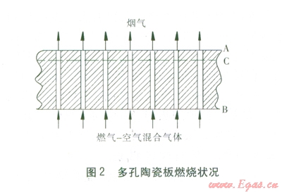 多孔陶瓷板燃燒狀況見圖2[1-2]。陶瓷板紅外輻射式燃燒器的輻射面是布滿許多小孔道的陶瓷板,當(dāng)燃?xì)?span lang="EN-US">-空氣混合氣體通過小孔道著火后,燃燒所產(chǎn)生的熱量主要加熱煙氣和陶瓷板,其中陶瓷板得到的熱量大部分由A面向外輻射。當(dāng)?shù)蜏氐娜細(xì)?span lang="EN-US">-空氣混合氣體從B面流進(jìn)孔道以后,對孔道壁進(jìn)行沖刷冷卻,同時(shí)其本身沿孔道長度方向溫度逐漸升高,當(dāng)接近A面時(shí),又得到來自火焰面的輻射熱,使其立即達(dá)到著火溫度而燃燒。隨著陶瓷板外表面溫度的升高,其沿A—B各點(diǎn)溫度也相應(yīng)升高,使小孔道內(nèi)的未燃混合氣體預(yù)熱溫度也相應(yīng)升高,加劇了燃燒反應(yīng),提高了燃燒溫度和火焰?zhèn)鞑ニ俣龋鹧婷鎻?span lang="EN-US">A面向板內(nèi)移動,同時(shí)燃燒溫度升高,增加了陶瓷板內(nèi)各點(diǎn)溫度,使其既向外增加輻射熱,又提高了小孔道內(nèi)未燃混合氣體的預(yù)熱溫度。當(dāng)燃燒反應(yīng)熱等于散熱而達(dá)到熱平衡后,燃?xì)?span lang="EN-US">-空氣混合氣體的預(yù)熱溫度不再升高并有可能在離A面某一距離的C而就達(dá)到著火溫度。氣流速度和火焰?zhèn)鞑ニ俣冗_(dá)到一定的動平衡,火焰面就穩(wěn)定在C而上。如果增加負(fù)荷即增加燃燒反應(yīng)熱,而陶瓷板的散熱速度小于反應(yīng)熱的生成速度,則火焰面向B面移動,此時(shí),靠近陶瓷板內(nèi)表面B面處的燃?xì)?span lang="EN-US">-空氣混合氣體預(yù)熱溫度升高很快,當(dāng)達(dá)到著火溫度時(shí),火焰面就立即移至外殼內(nèi)形成回火,稱為熱回火,即負(fù)荷過大使相應(yīng)的火孔熱強(qiáng)度大而產(chǎn)生熱回火。