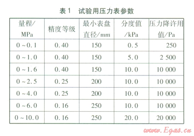 本文針對(duì)各種試驗(yàn)用壓力表量程,選取不同壓力降許用值,見(jiàn)表l。這樣規(guī)定的壓力降是讀數(shù)誤差,實(shí)際上相當(dāng)于不允許泄漏。