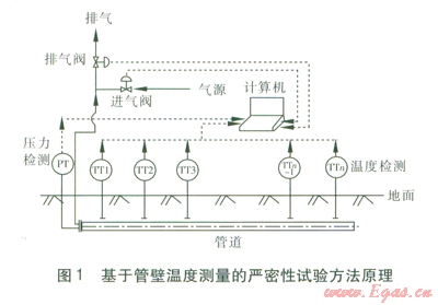 如上所述,采用現(xiàn)有的嚴(yán)密性試驗(yàn)方法無(wú)法準(zhǔn)確判斷燃?xì)夤艿赖膰?yán)密性情況,因此本文提出一種基于管壁溫度測(cè)量的嚴(yán)密性試驗(yàn)方法。該方法原理見(jiàn)圖l,具有下列特點(diǎn):