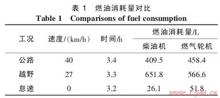 AGT-1500燃?xì)廨啓C(jī)具有回?zé)嵫b置。按照車(chē)輛使用性質(zhì),美國(guó)陸軍分別在公路、越野、怠速3種不同工況下對(duì)柴油機(jī)和燃?xì)廨啓C(jī)進(jìn)行實(shí)際試驗(yàn)。表1為該實(shí)驗(yàn)的部分?jǐn)?shù)據(jù)。