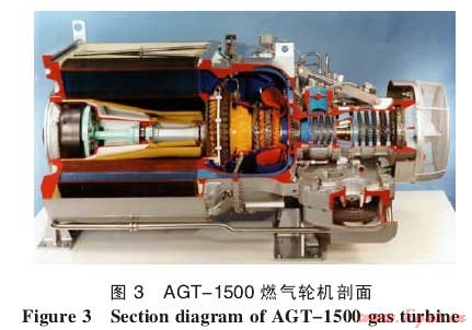 AGT-1500燃?xì)廨啓C(jī)的剖面見(jiàn)圖3。該燃?xì)廨啓C(jī)為三軸結(jié)構(gòu):低壓轉(zhuǎn)子、高壓轉(zhuǎn)子和動(dòng)力渦輪轉(zhuǎn)子。5級(jí)軸流式低壓壓氣機(jī)帶可調(diào)進(jìn)口導(dǎo)流葉片;高壓壓氣機(jī)由4級(jí)軸流式壓氣機(jī)和單級(jí)離心式壓氣機(jī)組成;每個(gè)壓氣機(jī)轉(zhuǎn)子由單級(jí)渦輪帶動(dòng),高壓渦輪導(dǎo)向葉片與工作葉片均為空心氣冷。2級(jí)動(dòng)力渦輪帶可變幾何進(jìn)口導(dǎo)流葉片,高壓壓氣機(jī)排出的空氣經(jīng)回?zé)崞鞅粍?dòng)力渦輪排出的燃?xì)饧訜岷笤龠M(jìn)入單管式燃燒室。燃?xì)廨啓C(jī)由全功能數(shù)字電子調(diào)節(jié)器自動(dòng)控制。
