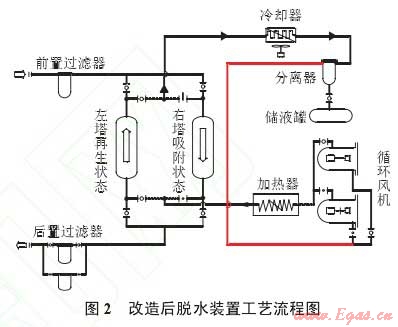 (2)脫水裝置雙塔閉式循環(huán)再生時(shí),常因系統(tǒng)壓力超高使再生被迫停止,即使減壓再生,吸附塔與再生塔會(huì)相互污染,無法獲得理想的再生效果。