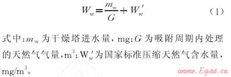 根據(jù)上述已知條件計(jì)算可得,在吸附周期(處理天然氣,使其含水量符合國(guó)家標(biāo)準(zhǔn)的連續(xù)工作時(shí)間)內(nèi),干燥塔最多可吸附45kg的水(分子篩動(dòng)態(tài)吸附量為靜態(tài)吸附量的10%)。由式(1)可得,改造前工藝來氣含水量908mg/m3,改造后工藝來氣含水量53mg/m3。