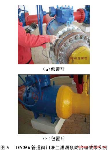 泄漏,然后按照上述施工流程對法蘭進行碳纖維復合材料堵漏加固處理,待復合材料養(yǎng)護固化后,進行耐壓密封試驗。結果表明:采用碳纖維復合材料進行管道法蘭滲漏治理,管道系統(tǒng)連接法蘭在 10 MPa 介質壓力下,露天環(huán)境下穩(wěn)壓 14 d,堵漏區(qū)域無任何泄漏??梢?,該套技術方案對存在泄漏隱患的管道法蘭泄漏治理非常有效。由于該套技術方案具有作業(yè)不動火、操作安全、成本費用低等特點,2008-2011年,采用復合材料修復技術對西氣東輸全線 220 多個線路閥室旁通管道 DN356 閥門連接法蘭及各站場與干線連接的DN50 和 DN80 管道法蘭泄漏隱患進行治理(圖 3),在確保管道安全平穩(wěn)運行的同時,節(jié)約了大量維修費用。復合材料修復對法蘭結構具有一定的加固作用,可提高法蘭的抗軸向拉伸、彎曲能力,防止密封面泄漏情況進一步惡化。但是,對于已經出現明顯泄漏的高壓(7 MPa 以上)法蘭,治理效果不佳。