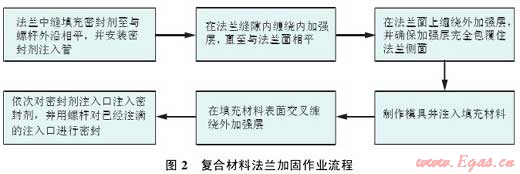 基本原理:對連接法蘭面間隙填充高強度堵漏密封材料,再用由高強度纖維與環(huán)氧粘結劑組成的復合材料對法蘭連接部位進行整體外包覆,待復合材料結構固化后,形成一個高強度殼體結構,實現整體加固,達到預防法蘭泄漏的目的(圖 2)。