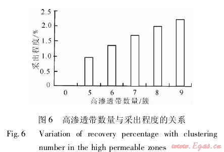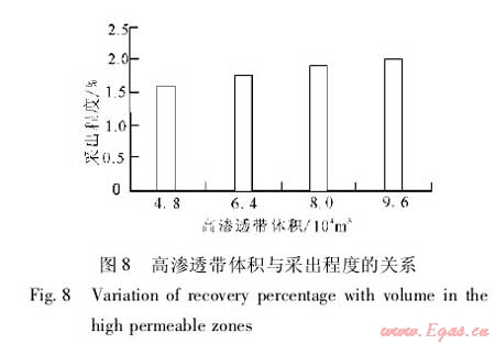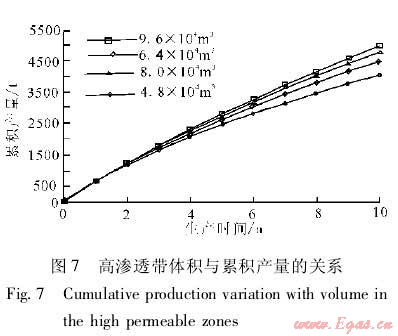 在建立的數(shù)值模型中嵌入高滲透帶,改變高滲透帶的特征參數(shù),通過數(shù)值模擬分析高滲透帶對累積產(chǎn)量和采出程度的影響。