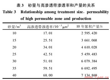 從表3知,隨著加砂規(guī)模的增大,高滲透帶的滲透率和壓裂后的產(chǎn)量逐漸增大,當單簇高滲透帶加砂規(guī)模大于25m3時,累積產(chǎn)量增加趨勢減緩。由圖7和圖8數(shù)值模擬結(jié)果知本井優(yōu)化的高滲透帶滲透率上限為40×10-3μm2,對應的砂量為20~25m3。綜合考慮施工風險,建議本井高滲透帶滲透率取30×10-3μm2左右,每簇高滲透帶的砂量為15~20m3。
