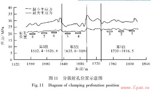 本井優(yōu)化的高滲透帶數(shù)量為8簇,因此,射孔簇數(shù)為8簇。綜合選擇GR(自然伽馬)低、脆性礦物含量高、應力值相對較低的層段進行射孔,以有利于裂縫延伸起裂,形成縫網(wǎng)(圖11)。根據(jù)應力測試,QY2井最小主應力在22.1~32.4MPa之間,因此,支撐劑應滿足35MPa閉合壓力要求。