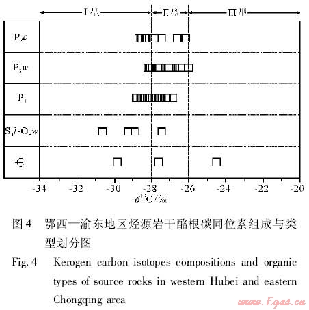 (3)本區(qū)長興組和飛仙關組天然氣的氣源巖主要為二疊系吳家坪組(P2w)烴源巖,且以Ⅱ型有機質為主,能夠生成大量的原油,具備原油裂解作用發(fā)生的物質基礎。對于本區(qū)高成熟度的天然氣而言,利用同位素資料進行氣—巖對比是比較可靠的方法。本區(qū)侏羅系和石炭系天然氣的丁烷碳同位素分別為-25.0‰和-31.9‰,而三疊系天然氣丁烷的含量低,只測得丙烷碳同位素為-27.6‰,下志留統(tǒng)龍馬溪組(S1l)、吳家坪組(P2w)和侏羅系源巖干酪根的碳同位素均值分別為-30.0‰、-27.0‰和-25.5‰(圖3)。有研究表明,具有氣源關系的烴源巖的干酪根碳同位素比天然氣丁烷的碳同位素要重1.0‰左右[15]。根據這種對應關系,侏羅系、三疊系飛仙關組和石炭系的天然氣應該分別來源于侏羅系、二疊系吳家坪組和志留系龍馬溪組烴源巖(圖3)。從生儲配置關系來看,飛三段與上覆侏羅系之間有較厚的隔層,其氣源也不可能來自于侏羅系烴源巖;并且飛三段天然氣的碳同位素組成明顯重于石炭系天然氣(圖3),其不可能與石炭系天然氣具有相同的氣源巖。對于本區(qū)高過成熟的二疊系烴源巖(Ro均值為2.2%)而言,其有機質類型用常規(guī)熱解和元素組成數(shù)據很難判斷[16],比較可靠的方法是利用源巖干酪根碳同位素數(shù)據進行分析。本區(qū)二疊系吳家坪組烴源巖的干酪根碳同位素值為-26.0‰~-28.2‰,與Ⅱ型有機質具有較好的對應關系;志留系烴源巖的干酪根碳同位素在-27.0‰~-31.0‰,主要為Ⅰ型有機質;寒武系烴源巖的干酪根碳同位素比較分散,類型可能比較復雜(圖4)。根據上述分析,本區(qū)吳家坪組烴源巖有機質類型主要為Ⅱ型,以生油為主。