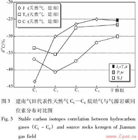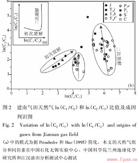 (1)天然氣的成分組成具有原油二次裂解氣的特征。飛三段(T1f3)和長興組(P2c)天然氣的烷烴氣中以甲烷為主(相對含量在99%以上),為成熟度很高的干氣。有機成因的烷烴氣大致包括生物氣、干酪根熱解氣和原油裂解氣。本區(qū)天然氣甲烷的碳同位素在-30.0‰~-33.0‰,可排除生物成因氣。因此,對本區(qū)天然氣的成因判識的關鍵是區(qū)分干酪根熱解氣和原油裂解氣。這兩類成因天然氣,目前國內外學者主要用ln(C1/C2)與ln(C2/C3)關系圖進行判識[10-13]。干酪根初次熱解氣以甲烷的迅速增加為特征,ln(C1/C2)值不斷增大而ln(C2/C3)值相對穩(wěn)定;原油二次裂解氣以丙烷的迅速減少為特征,ln(C2/C3)值明顯增大而ln(C1/C2)值變化不大(圖2(a))。如圖2(b),研究區(qū)嘉陵江組(T1j)、飛三段(T1f3)、長興組(P2c)和下二疊統(tǒng)(P1)天然氣的ln(C1/C2)值在5~7,ln(C2/C3)值在1~4,總體符合ln(C2/C3)迅速增大、ln(C1/C2)相對穩(wěn)定的原油二次裂解氣的基本特征,志留系(S)與石炭系(C)的天然氣(ln(C1/C2)值在4~5,ln(C2/C3)值在1~2.5)也具有類似的特征,但分布范圍與前者明顯區(qū)別,表明這兩類天然氣的來源可能不同。三疊系巴東組(T2b)和侏羅系(J)的天然氣的ln(C1/C2)值在2.5~3.5,ln(C2/C3)值在1~2.5,總體表現(xiàn)為ln(C1/C2)值不斷增大而ln(C2/C3)值相對穩(wěn)定的干酪根初次熱解氣的特征。